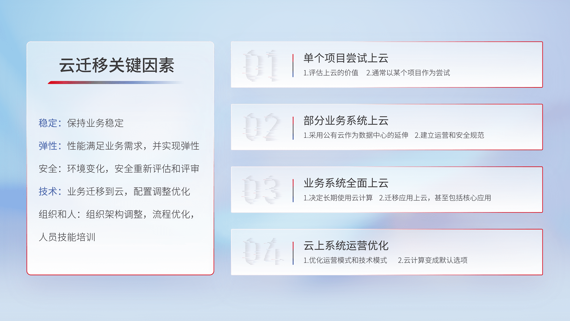 结合实际业务,,从规划设计、、、云平台选型、、、、云原生改造、、、数据迁移、、、集成交付,,,迁移全过程为客户识别最佳上云路径,,,,做好风险识别管理,,设计网络架构、、、身份权限、、、、安全审计合规、、操作审计、、、、日志审计、、、监控告警策略、、多站点容灾设计等,,,对云上基础设施进行整体规划,,提升IT治理水平,,,以满足弹性、、、高可用、、、高性能的需求。。。。