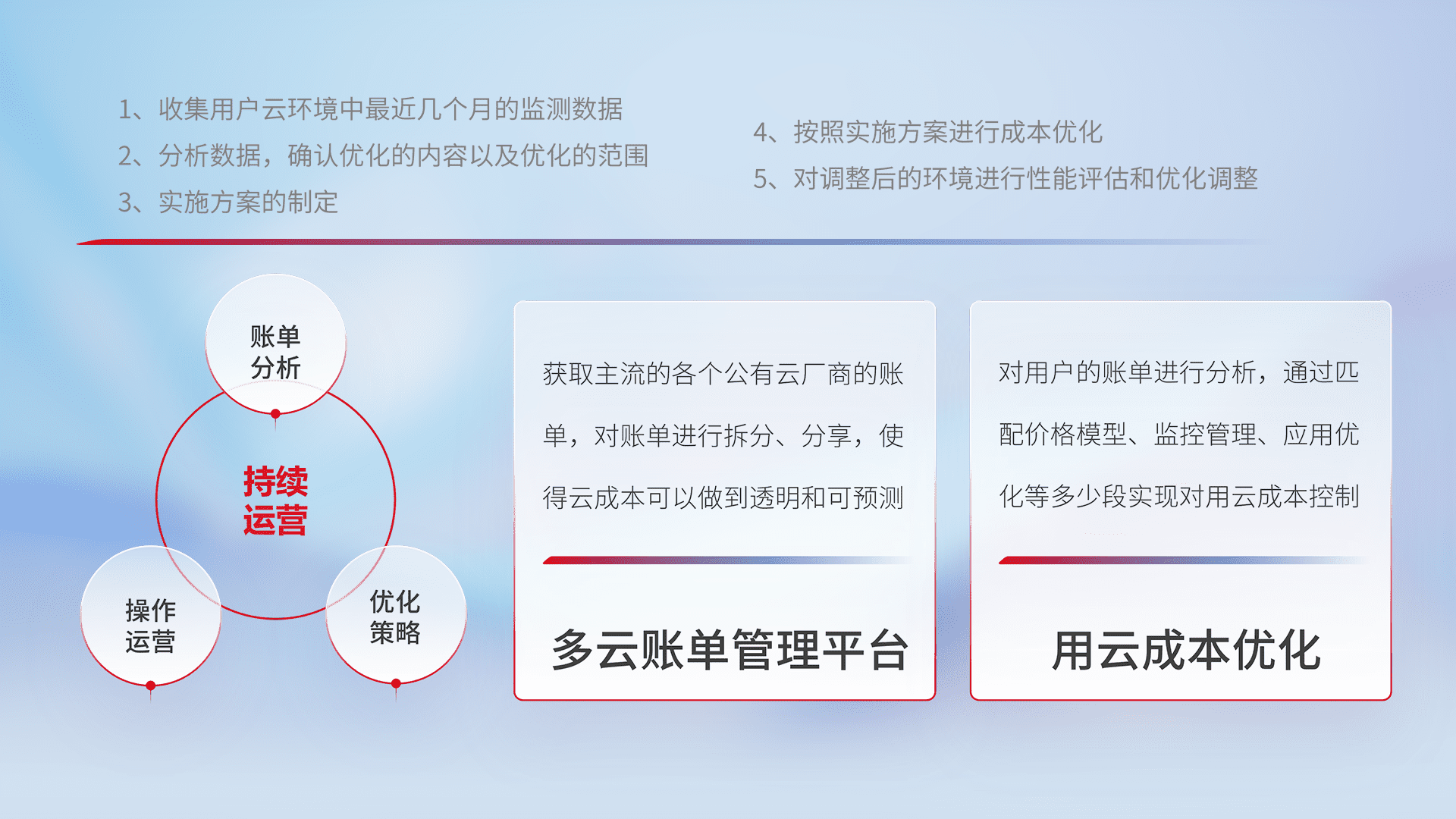 通过多云纳管,,,,以统一的资源数据模型把客户的云资源进行抽象和封装,,,进而实现对多云资源的统一操作,,保障云资源管理的可靠性、、稳定性与可用性。。。。量身定制化运维内容,,,,配置、、开发运维、、补丁管理、、、备份、、监控、、、认证和访问管理、、、审计和日常巡检等,,保障在用云过程中的可靠度,,,,稳定度以及高可用率。。